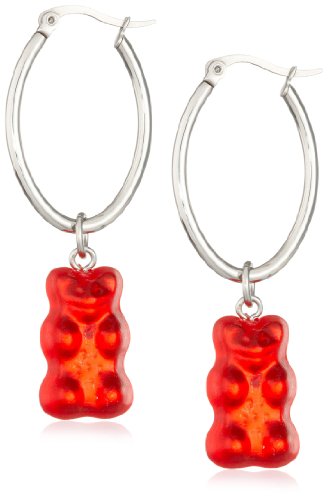 Haribo - 360128500 - Boucles d'Oreilles Créoles Femme/Junior - Créole ovale acier avec breloque ourson rouge silicone
